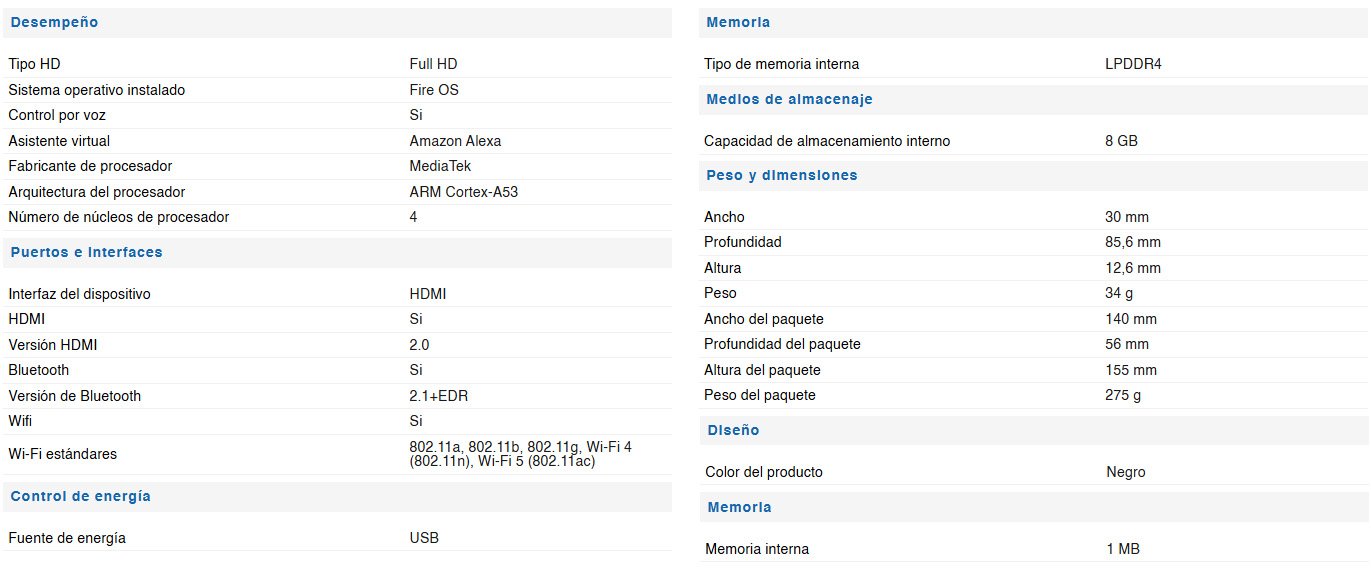 | Tipo HD: Full HD, Sistema operativo instalado: Fire OS, Fabricante de procesador: MediaTek. Interfaz del dispositivo: HDMI, Wi-Fi estándares: 802.11a, 802.11b, 802.11g, Wi-Fi 4 (802.11n), Wi-Fi 5 (802.11ac), Versión de Bluetooth: 2.1+EDR. Fuente de energía: USB. Color del producto: Negro. Capacidad de almacenamiento interno: 8 GB. |