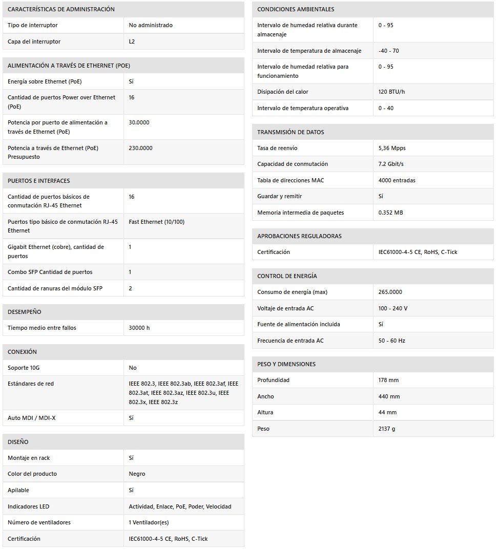 Soporta PoE (15W por puerto) y PoE+ (hasta 30W por puerto) para llevar la alimentación a los dispositivos. PoE Budget total de 230W.