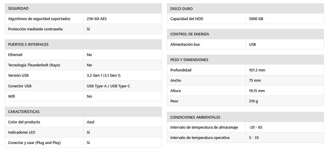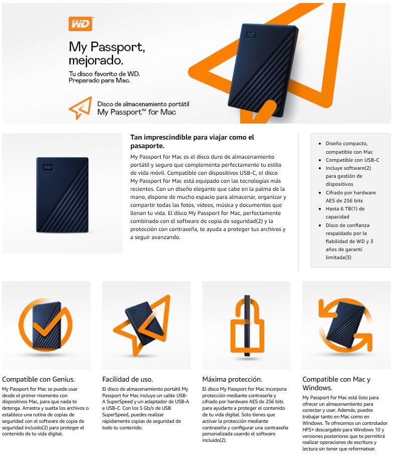 | Protege tus recuerdos más preciados, estés donde estés, con el disco duro portátil My Passport for Mac. Compatible con Mac y USB-C, este dispositivo de almacenamiento de alta capacidad proporciona una conectividad USB impecable, lo que te permite acceder fácilmente a tus valiosos archivos en cualquier momento y lugar. Aprovecha al máximo el software Acronis® True Image™ for Western Digital incluido2 para realizar copias de seguridad seguras de tus datos, reforzadas con una sólida protección contra las amenazas de ransomware. No dejes que se te escape ningún recuerdo: mantenlos a buen recaudo y accesibles con el disco duro portátil My Passport. Compatible con Mac. Compatible con Windows. Compatible con USB-C, el disco duro portátil My Passport for Mac está listo para usarse con dispositivos Mac. Incluye un controlador HFS+ descargable para facilitar las operaciones de lectura y escritura del disco en ordenadores con Windows 10 y versiones posteriores sin tener que reformatear. Diseño compacto Diseño compacto y duradero para hacer que tu ajetreada vida sea más cómoda y conveniente. Su robusta construcción te proporciona un compañero fiable para tus aventuras. Gran capacidad Disfruta de todas las posibilidades que ofrecen hasta 6 TB1 de capacidad de almacenamiento, lo que te proporciona espacio de sobra para llevar tus fotos, vídeos, música y documentos importantes y tenerlo todo siempre a mano allá donde vayas. Copias de seguridad sencillas. Ofrece protección contra el ransomware Programar copias de seguridad de tus valiosos archivos es más fácil con el software Acronis True Image for Western Digital incluido2. También te ayuda a reforzar tus aplicaciones importantes y a proteger tu sistema informático contra la pérdida de datos causada por ataques de ransomware. Protege las cosas más importantes Protege tus archivos contra accesos no autorizados, en casa o de viaje. Utiliza nuestro software incluido2 para añadir un nivel adicional de seguridad con la protección mediante contraseña y el cifrado AES de 256 bits integrado. Diseñado pensando en el planeta La carcasa de este disco se compone de más de un 50 % de plástico reciclado posconsumo. El embalaje está fabricado con más de un 50 % de pulpa reciclada posconsumo y es totalmente reciclable. |