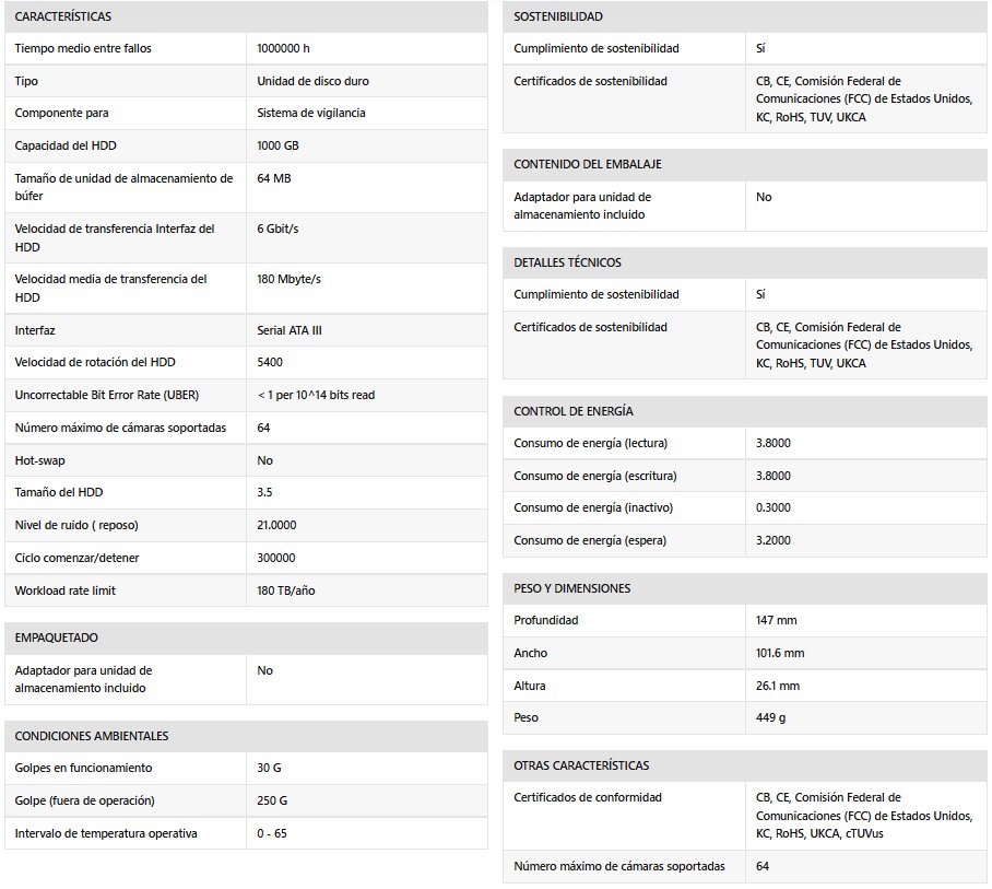 Disco Duro Western Digital Purple para vigilancia 1 TB 3,5″ 5400 RPM SATA III Precio del Fabricante: 120 Euros |