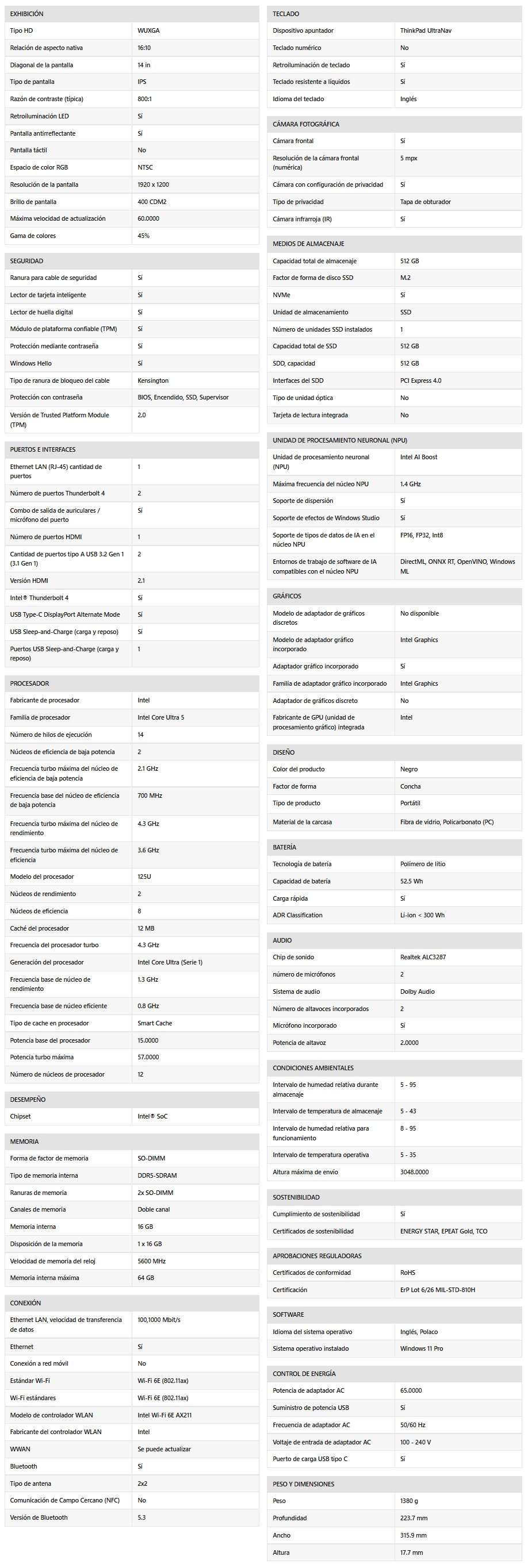 | Visión del siguiente nivel: atrevida y brillante. Ya sea para ver o crear, disfruta de una excelente calidad de contenidos en el portátil ThinkPad T14 Gen 5 de 14″. Sus soluciones ópticas 3M aumentan la eficiencia de la pantalla, maximizando los niveles de brillo y reduciendo el consumo de energía. Además, sus opciones de pantalla OLED de hasta 2,8k, sus biseles estrechos y Dolby Vision® garantizan una imagen rica y vibrante. Certificado para la protección Eyesafe® y TÜV Low Blue Light, evita la fatiga ocular durante largas jornadas de trabajo. Además, es fino, ligero y está disponible en dos elegantes colores, Eclipse Black y Luna Grey para combinar con tu estilo personal. Diseño inclusivo para un fácil acceso. Nuestro renovado teclado ThinkPad incluye ahora marcas táctiles para facilitar la localización de las teclas a las personas con problemas de visión. Por si fuera poco, nuestro TrackPad es más grande y ahora mide 120 mm/4,72?. Y nuestro preciado TrackPoint rojo sigue permitiéndote navegar y, con un doble toque, abre el menú rápido de ThinkPad TrackPoint que te permite optimizar los contenidos audiovisuales, activar alertas frente al modo de silencio e incluso tomar notas con la barra de herramientas de dictado para transcribir fácilmente voz a texto. Tranquilidad, calma y seguridad. Mejora tu eficiencia con una gestión térmica avanzada y una mejora adaptativa de la batería adaptada a tu flujo de trabajo. El portátil ThinkPad T14 Gen 5 viene equipado con ventiladores duales y conductos de ventilación traseras estratégicamente situadas para garantizar una eficiencia de refrigeración óptima mientras realiza sus tareas informáticas. Y, al adaptarse a tu carga de trabajo, prolonga la duración de la batería cuando más la necesitas. Además, incluye seguridad ThinkShield para una protección completa de los datos e incorpora un lector de huellas dactilares match-on-chip integrado en el botón de encendido para permitir el acceso seguro al dispositivo. Cambios y reparaciones simplificados. Diseñado para resistir, el portátil ThinkPad T14 Gen 5 se ha diseñado para facilitar las actualizaciones con componentes intercambiables. Puedes reemplazar o reparar fácilmente tu sistema con cómodas unidades reemplazables por el cliente (CRU), incluso sin conocimientos técnicos. De hecho, gracias a su sencillo mantenimiento y a su extraordinaria facilidad de reparación, este portátil ostenta un 9,3/10 en la puntuación en cuanto a posibilidad de reparación de iFixit. Así que, tanto si quieres actualizar componentes como ampliar la vida útil de tu dispositivo, puedes confiar en nuestros Support Services para mantener tu sistema y tu empresa en funcionamiento. Construcción robusta, resistencia. En los portátiles ThinkPad aplicamos el estándar MIL-STD 810H del Departamento de Defensa de EE. UU. para crear un equilibrio entre fiabilidad y durabilidad. El cumplimiento o la superación de 12 estándares, 26 procedimientos y más de 200 controles de calidad garantizan el funcionamiento de estos dispositivos en condiciones extremas, incluidas variables adversas como la vida salvaje del Ártico, tormentas de polvo en el desierto, temperaturas extremas, presión, humedad, vibraciones, etc. Además, aunque el ThinkPad T14 Gen 5 está diseñado para ofrecer durabilidad, también está diseñado para ser eficiente desde el punto de vista energético con la certificación ENERGY STAR® 8.0. |