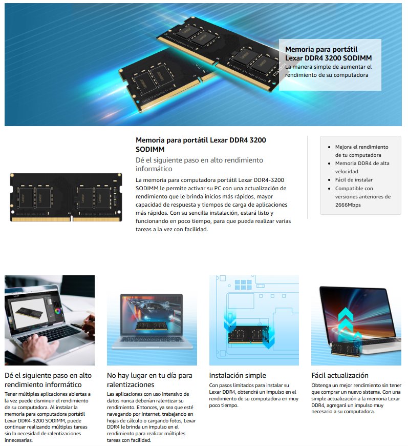| La memoria para portátil Lexar DDR4-3200 SODIMM le permite activar su PC con una actualización de rendimiento, que le brinda inicios más rápidos, mayor capacidad de respuesta y tiempos de carga de aplicaciones más rápidos. Con su sencilla instalación, estará listo y funcionando en poco tiempo, para que pueda realizar múltiples tareas con facilidad. |