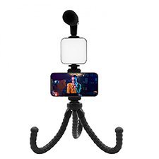 | -Muvit Vlogging Kit 4 en 1 Micrófono Trípode Soporte LED -Trípode flexible -Soporte para smartphone (10 cm de ancho) -Flash ajustable con 49 LEDs blancos y 10 niveles de intensidad -Micrófono unidireccional con pantalla anti-viento |